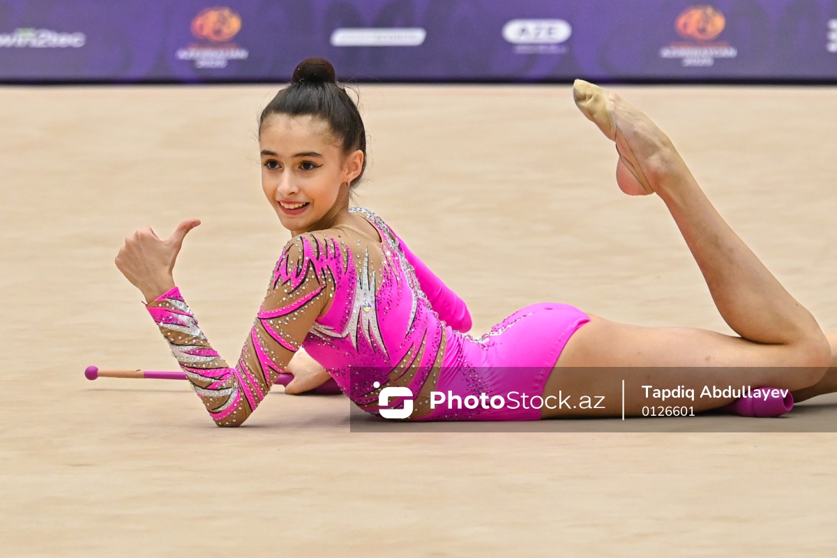 III MDB Oyunlarında bədii gimnastika üzrə yarışlarda mübarizə aparan Azərbaycan təmsilçisi Azadə Atakişiyeva.
