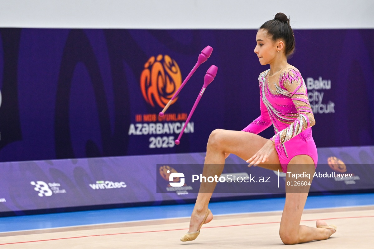III MDB Oyunlarında bədii gimnastika üzrə yarışlarda mübarizə aparan Azərbaycan təmsilçisi Azadə Atakişiyeva.