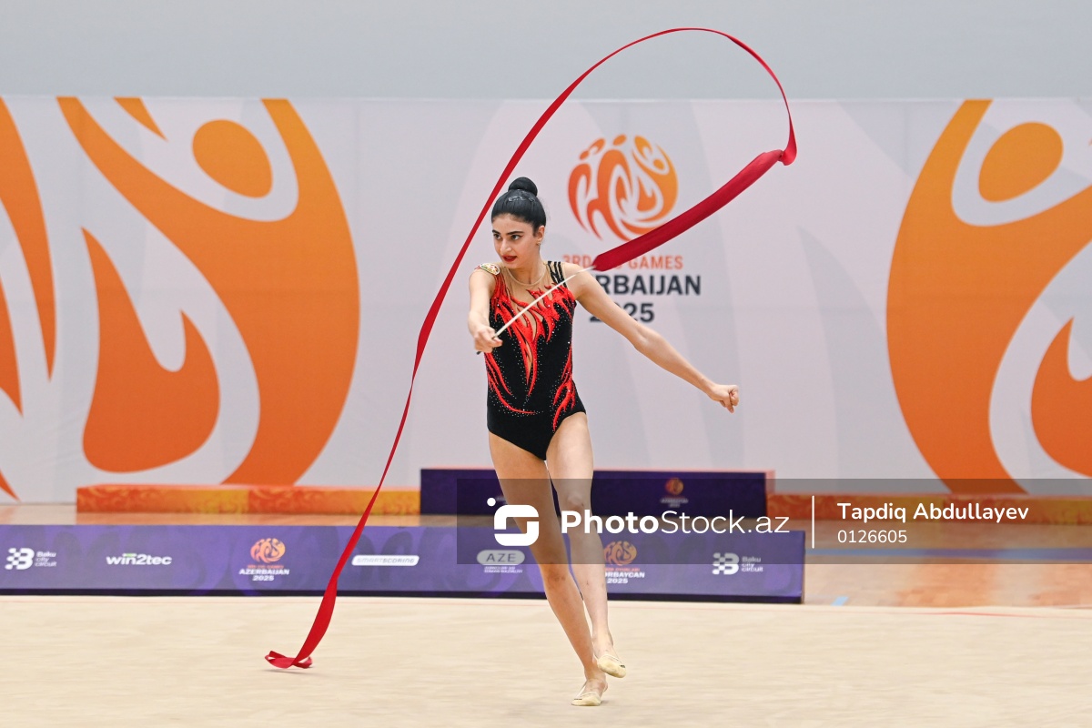 III MDB Oyunlarında bədii gimnastika üzrə yarışlarda mübarizə aparan Azərbaycan təmsilçisi Şəms Ağahüseynova.