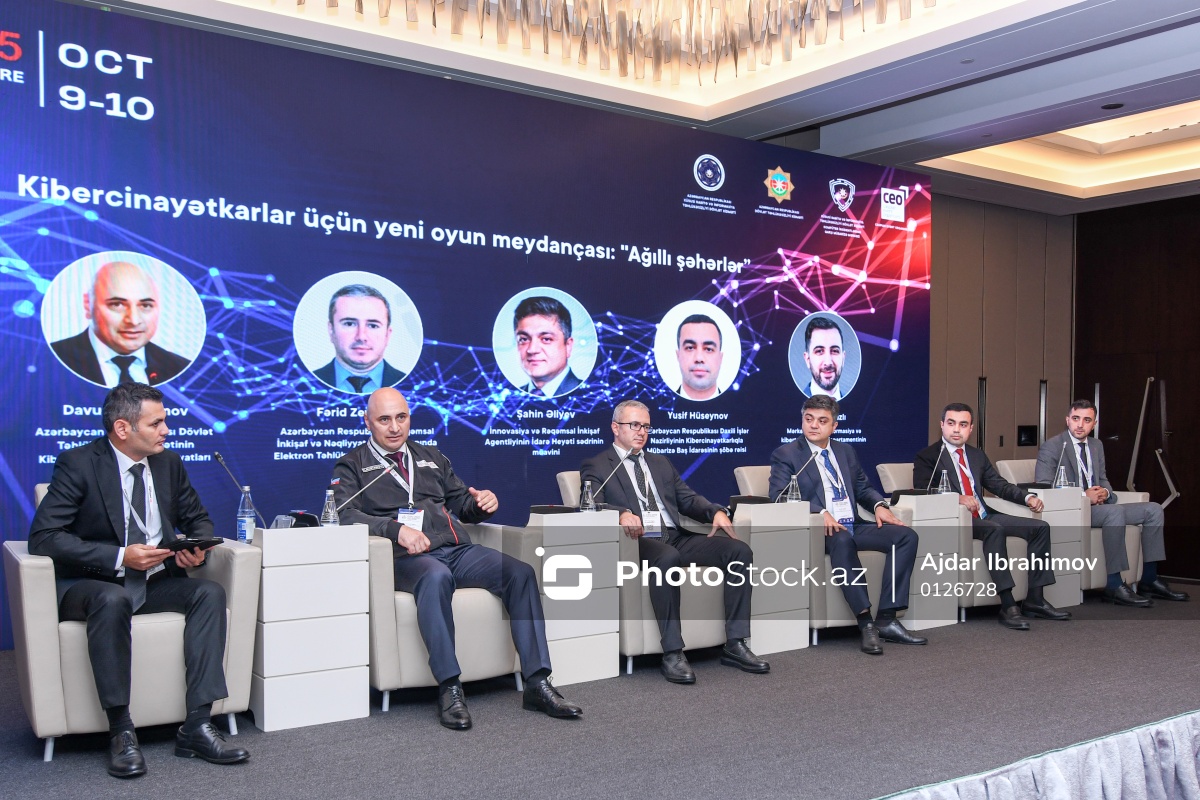 "Critical Infrastructure Defence Challenge" ("CIDC 2025") kibertəhlükəsizlik festivalı çərçivəsində "Kibercinayətkarlar üçün yeni oyun meydançası: "Ağıllı şəhərlər" başlıqlı paneldə iştirak edən (soldan-sağa) Xüsusi Rabitə və İnformasiya Təhlükəsizliyi Dövlət Xidmətinin baş idarə rəisinin müavini Tural Məmmədov, Dövlət Təhlükəsizliyi Xidmətinin Milli Kibertəhlükəsizlik Mərkəzinin rəisi Davud Rüstəmov, Rəqəmsal İnkişaf və Nəqliyyat Nazirliyi yanında Elektron Təhlükəsizlik Xidmətinin rəisi Fərid Zeynalov, İnnovasiya və Rəqəmsal İnkişaf Agentliyinin İdarə Heyəti sədrinin müavini Şahin Əliyev, Daxili İşlər Nazirliyinin Kibercinayətkarlıqla Mübarizə Baş İdarəsinin şöbə rəisi Yusif Hüseynov, Mərkəzi Bankın İnformasiya və kibertəhlükəsizlik departamentinin direktoru Elnur Eyvazlı.