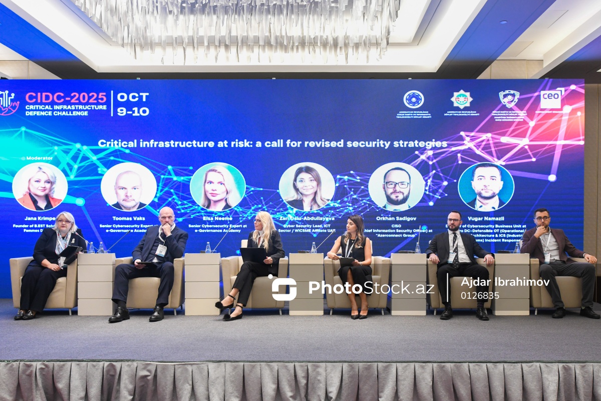 "Critical Infrastructure Defence Challenge" ("CIDC 2025") kibertəhlükəsizlik festivalı çərçivəsində “Kritik infrastruktur risk altındadır: təhlükəsizlik strategiyalarının yenilənməsinə çağırış” başlıqlı paneldə iştirak edən (soldan-sağa) “B.EST Solutions Azerbaijan” şirkətinin və “FEMMES DIGITALES” İctimai Birliyinin təsisçisi Jana Krimpe, Estoniyanın Elektron İdarəçilik Akademiyasının kibertəhlükəsizlik üzrə baş mütəxəssisi Toomas Vaks, Estoniyanın Elektron İdarəçilik Akademiyasının kibertəhlükəsizlik üzrə baş mütəxəssisi Elsa Neeme, Kibertəhlükəsizlik rəhbəri, Kibertəhlükəsizlikdə qadınlar Yaxın Şərq, BƏƏ tərəfdaşı Zari Uslu-Abdullayeva, "Azerconnect Group" şirkətinin İnformasiya təhlükəsizliyi üzrə baş müdiri Orxan Sadıqov, Müdafiə olunan Əməliyyat Texnologiyalarının (OT) arxitekturası və Sənaye Nəzarət Sistemlərində (ICS) insidentlərə reaksiya–"Techpro DC" şirkətinin Kibertəhlükəsizlik bölməsinin direktoru Vüqar Namazlı.