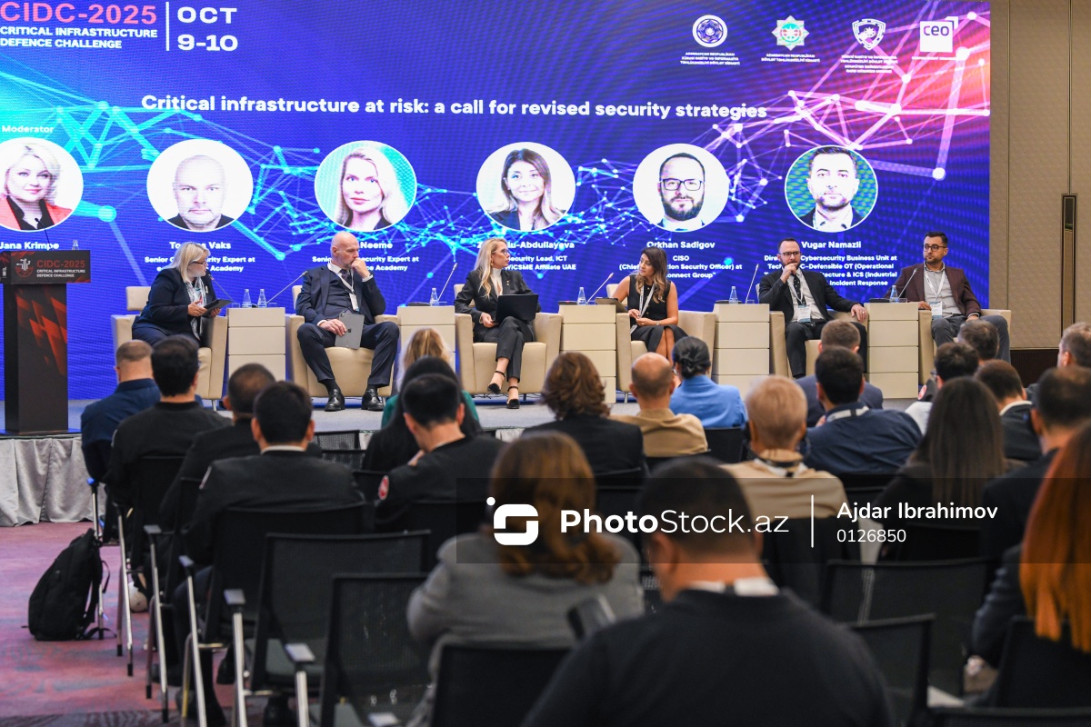 "Critical Infrastructure Defence Challenge" ("CIDC 2025") kibertəhlükəsizlik festivalı çərçivəsində “Kritik infrastruktur risk altındadır: təhlükəsizlik strategiyalarının yenilənməsinə çağırış” başlıqlı paneldə iştirak edən (soldan-sağa) “B.EST Solutions Azerbaijan” şirkətinin və “FEMMES DIGITALES” İctimai Birliyinin təsisçisi Jana Krimpe, Estoniyanın Elektron İdarəçilik Akademiyasının kibertəhlükəsizlik üzrə baş mütəxəssisi Toomas Vaks, Estoniyanın Elektron İdarəçilik Akademiyasının kibertəhlükəsizlik üzrə baş mütəxəssisi Elsa Neeme, Kibertəhlükəsizlik rəhbəri, Kibertəhlükəsizlikdə qadınlar Yaxın Şərq, BƏƏ tərəfdaşı Zari Uslu-Abdullayeva, "Azerconnect Group" şirkətinin İnformasiya təhlükəsizliyi üzrə baş müdiri Orxan Sadıqov, Müdafiə olunan Əməliyyat Texnologiyalarının (OT) arxitekturası və Sənaye Nəzarət Sistemlərində (ICS) insidentlərə reaksiya–"Techpro DC" şirkətinin Kibertəhlükəsizlik bölməsinin direktoru Vüqar Namazlı.