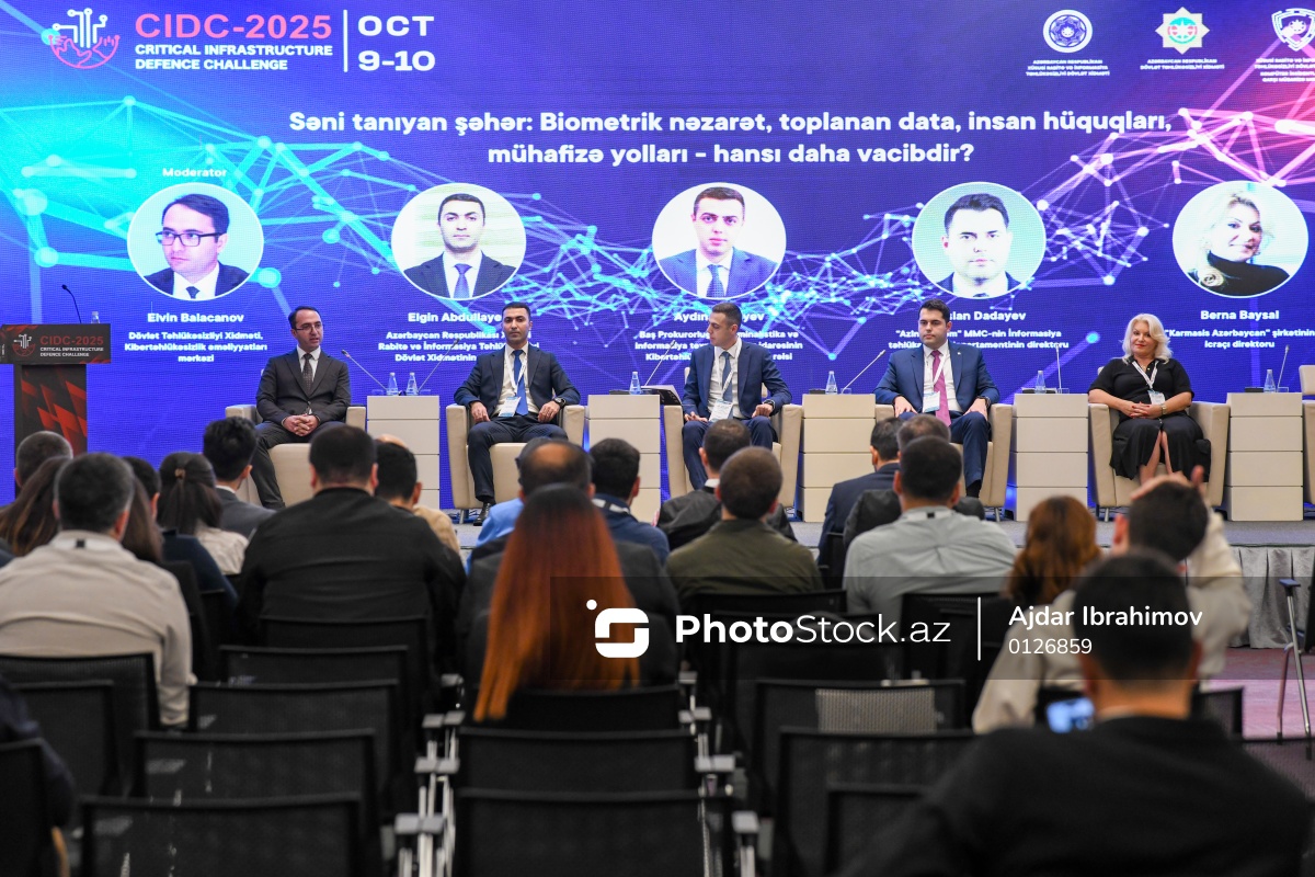 "Critical Infrastructure Defence Challenge" ("CIDC 2025") kibertəhlükəsizlik festivalı çərçivəsində “Səni tanıyan şəhər: Biometrik nəzarət, toplanan data, insan hüquqları, mühafizə yolları - hansı daha vacibdir?” başlıqlı paneldə iştirak edən (soldan-sağa) Dövlət Təhlükəsizliyi Xidmətinin Kibertəhlükəsizlik əməliyyatları mərkəzinin nümayəndəsi Elvin Balacanov, Xüsusi Rabitə və İnformasiya Təhlükəsizliyi Dövlət Xidmətinin şöbə rəisi Elgin Abdullayev, Baş Prokurorluğun Kriminalistika və informasiya texnologiyaları idarəsinin Kibertəhlükəsizlik şöbəsinin rəisi Aydın Verdiyev, "AzInTelecom" MMC-nin İnformasiya təhlükəsizliyi departamentinin direktoru Ruslan Dadayev, "Karmasis Azərbaycan" şirkətinin icraçı direktoru Berna Baysal.