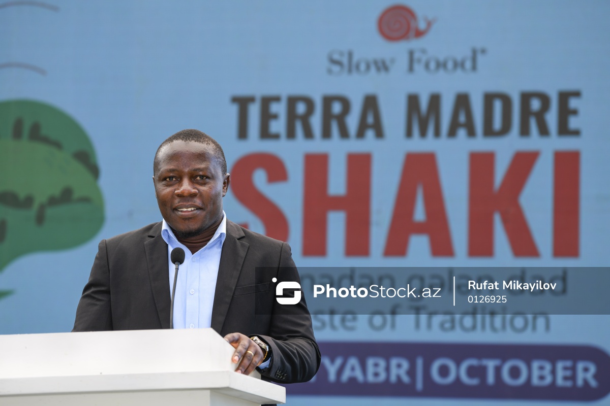 Şəkidə keçirilən "Terra Madre Shaki" qastronomiya festivalında çıxış edən "Slow Food International"ın prezidenti Edvard Mukibi.