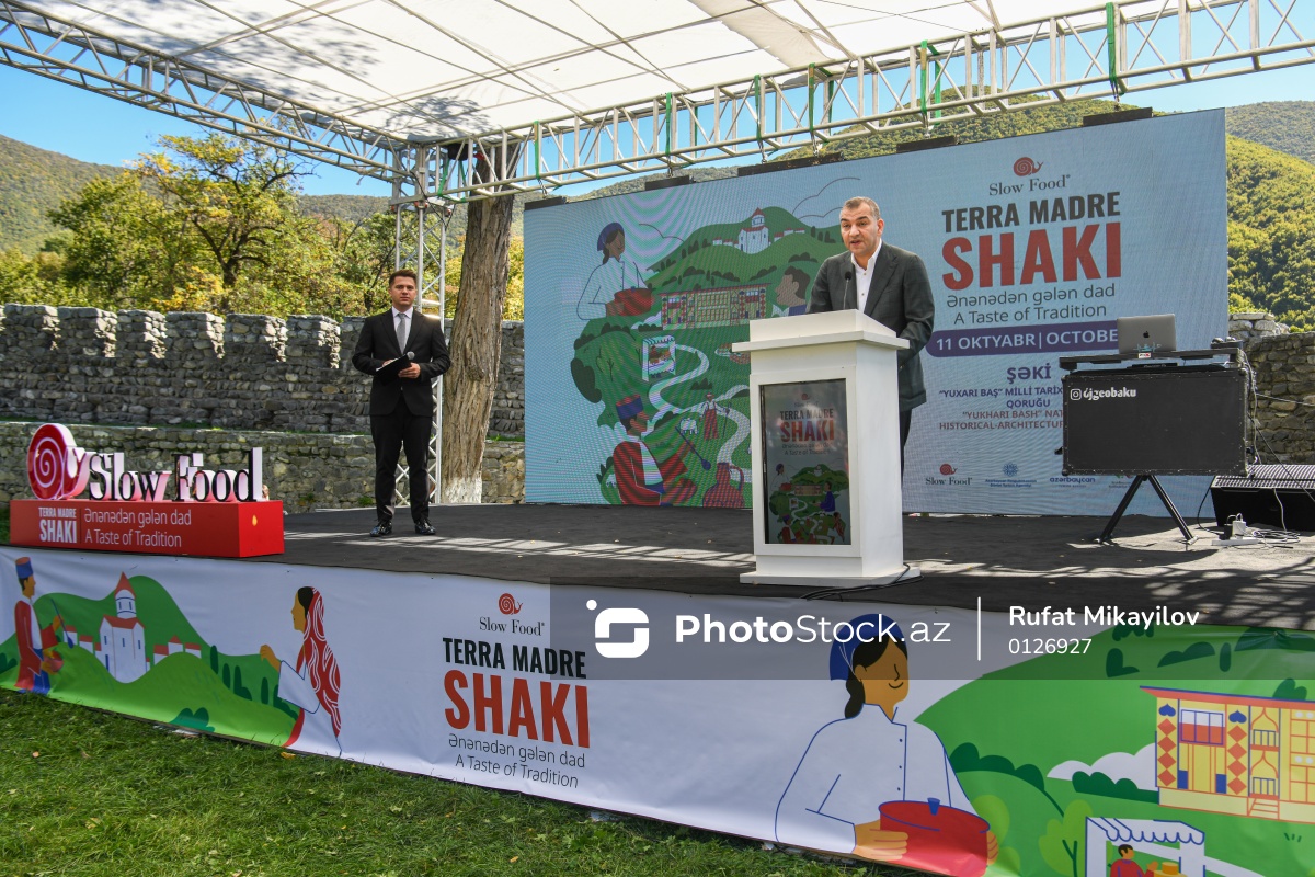 Şəkidə keçirilən "Terra Madre Shaki" qastronomiya festivalında çıxış edən Dövlət Turizm Agentliyinin sədri Fuad Nağıyev.