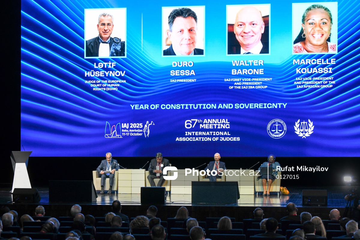 Bakıda Beynəlxalq Hakimlər Assosiasiyasının 67-ci Baş Assambleyası çərçivəsində "Konstitusiya və Suverenlik İli"nə həsr olunmuş "Məhkəmə hakimiyyəti və dövlətin digər iki qolu arasında münasibətlər" mövzusunda beynəlxalq konfransda iştirak edən (soldan-sağa) Avropa İnsan Hüquqları Məhkəməsinin hakimi Lətif Hüseynov, Beynəlxalq Hakimlər Assosiasiyasının prezidenti Duro Sessa, Beynəlxalq Hakimlər Assosiasiyasının birinci vitse-prezidenti Volter Barone, Beynəlxalq Hakimlər Assosiasiyasının vitse-prezidenti və Afrika qrupunun prezidenti Marcelle Kouassi.