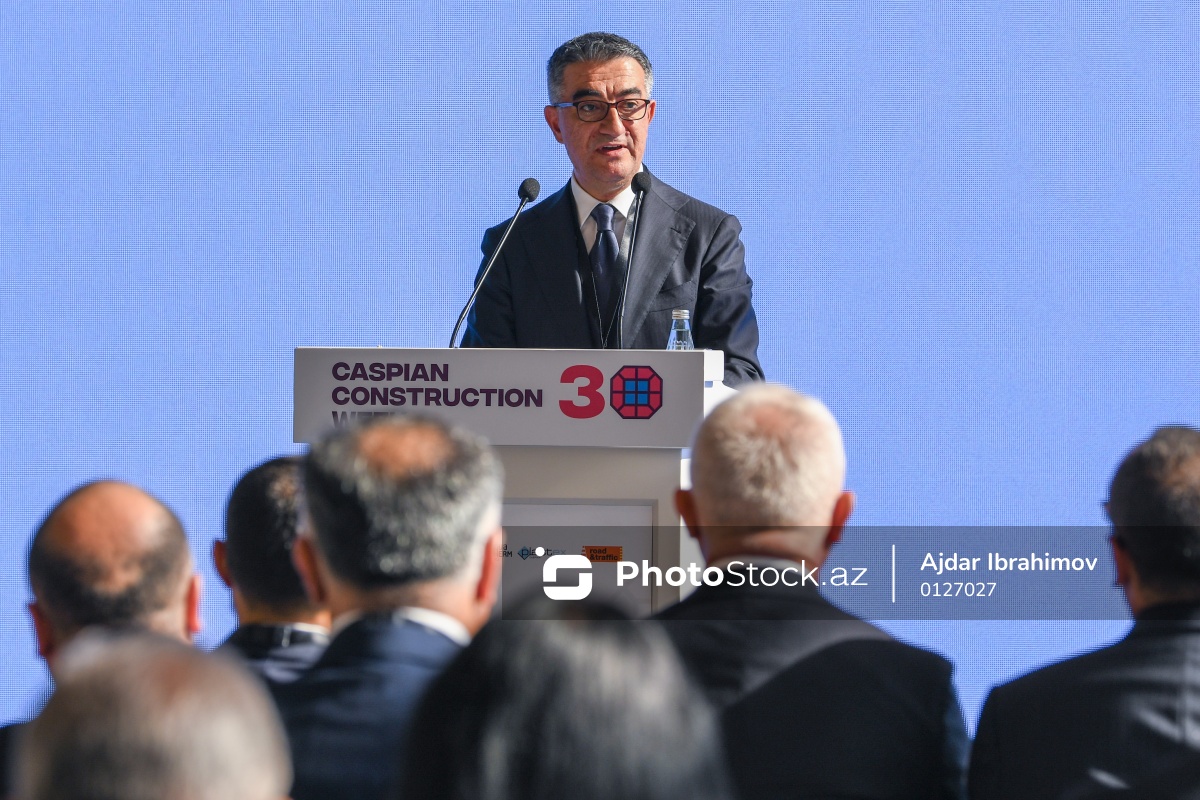 Bakı Ekspo Mərkəzində keçirilən "Rebuild Karabakh-2025" sərgisinin açılış mərasimində çıxış edən İqtisadiyyat Nazirliyi yanında Antiinhisar və İstehlak Bazarına Nəzarət Dövlət Agentliyinin sədri Elnur Bağırov.