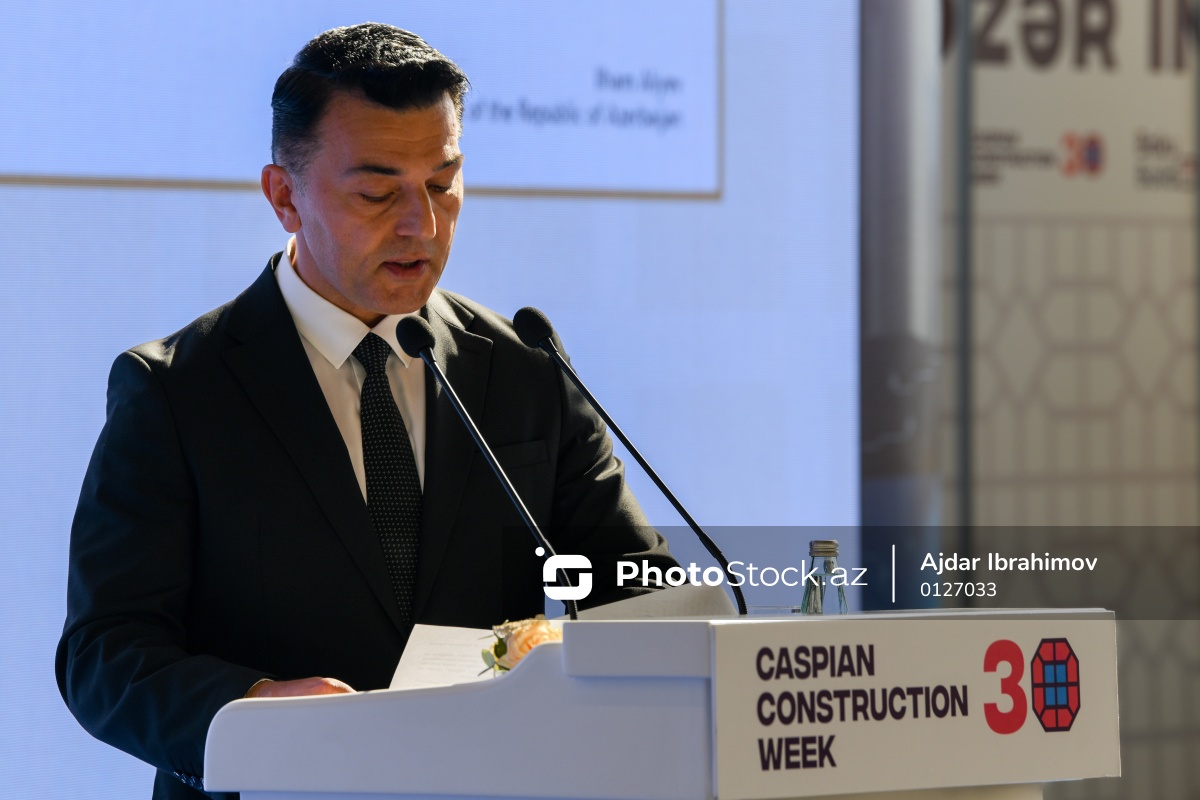 Bakı Ekspo Mərkəzində keçirilən "Rebuild Karabakh-2025" sərgisinin açılış mərasimində Prezident İlham Əliyevin müraciətini səsləndirən tədbirin aparıcısı Mətin Axundov.