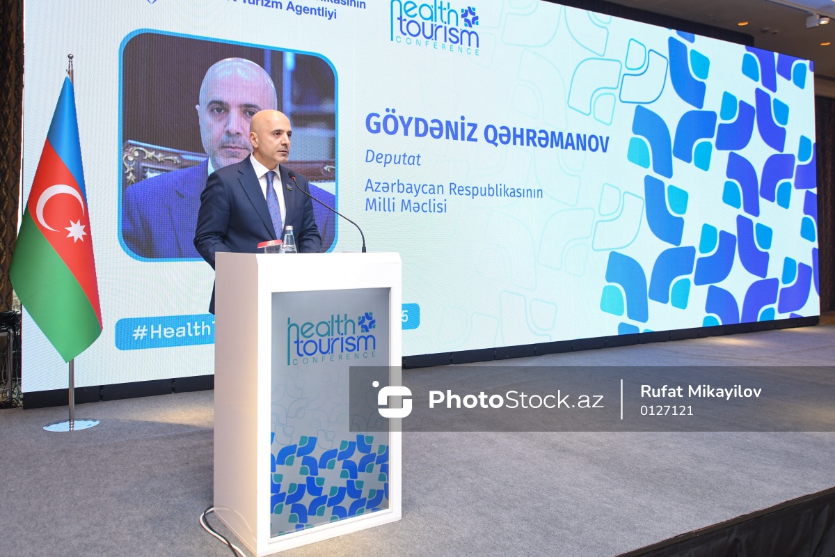 II “Azərbaycan sağlamlıq turizmi konfransı”nda çıxış edən Azərbaycan Turizm Agentlikləri Assosiasiyasının İdarə Heyətinin sədri, Milli Məclisin deputatı Göydəniz Qəhrəmanov.