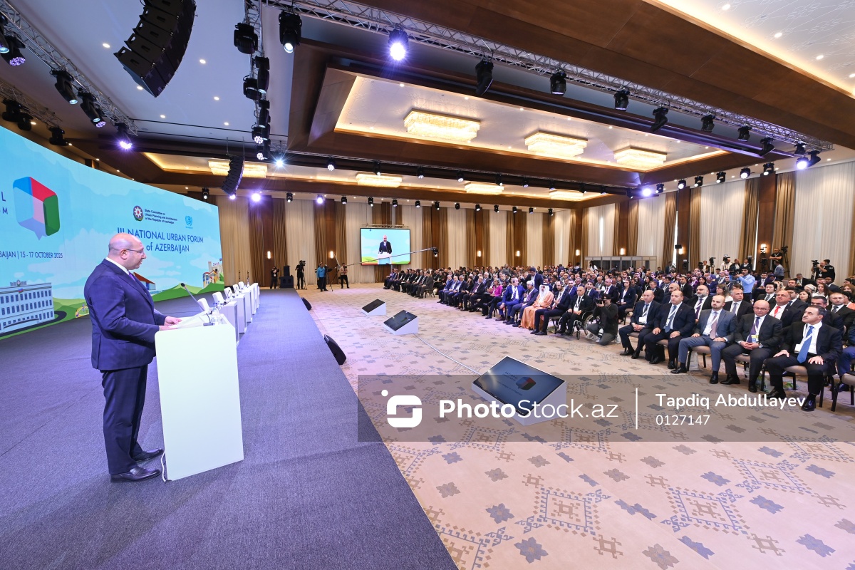 III Azərbaycan Milli Şəhərsalma Forumunda çıxış edən Dövlət Şəhərsalma və Arxitektura Komitəsinin sədri Anar Quliyev.