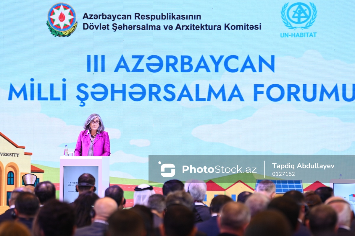 III Azərbaycan Milli Şəhərsalma Forumunda çıxış edən BMT-nin Şəhərsalma Proqramının (UN-Habitat) icraçı direktoru Anaklaudia Rosbax.