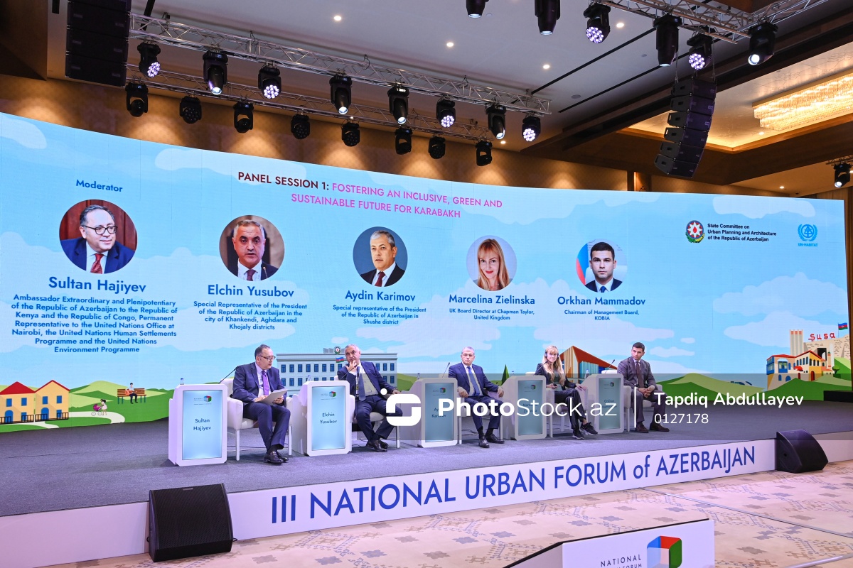 III Azərbaycan Milli Şəhərsalma Forumunda iştirak edən (soldan-sağa) Azərbaycanın Keniyadakı səfiri, BMT-nin Nayrobi şəhərindəki bölməsində daimi nümayəndəsi Sultan Hacıyev, Xankəndi şəhərində, Ağdərə və Xocalı rayonlarında Azərbaycan Respublikası Prezidentinin xüsusi nümayəndəsi Elçin Yusubov, Azərbaycan Respublikası Prezidentinin Şuşa rayonunda xüsusi nümayəndəsi Aydın Kərimov, Böyük Britaniyanın "Chapman Taylor" şirkətinin Direktorlar Şurasının rəhbəri Marcelina Zielinska, İqtisadiyyat Nazirliyi yanında Kiçik və Orta Biznesin İnkişafı Agentliyi İdarə Heyətinin sədri Orxan Məmmədov.