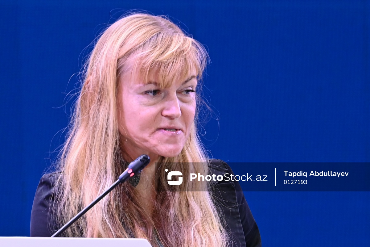 III Azərbaycan Milli Şəhərsalma Forumunda iştirak edən Böyük Britaniyanın "Chapman Taylor" şirkətinin Direktorlar Şurasının rəhbəri Marselina Zelinska.