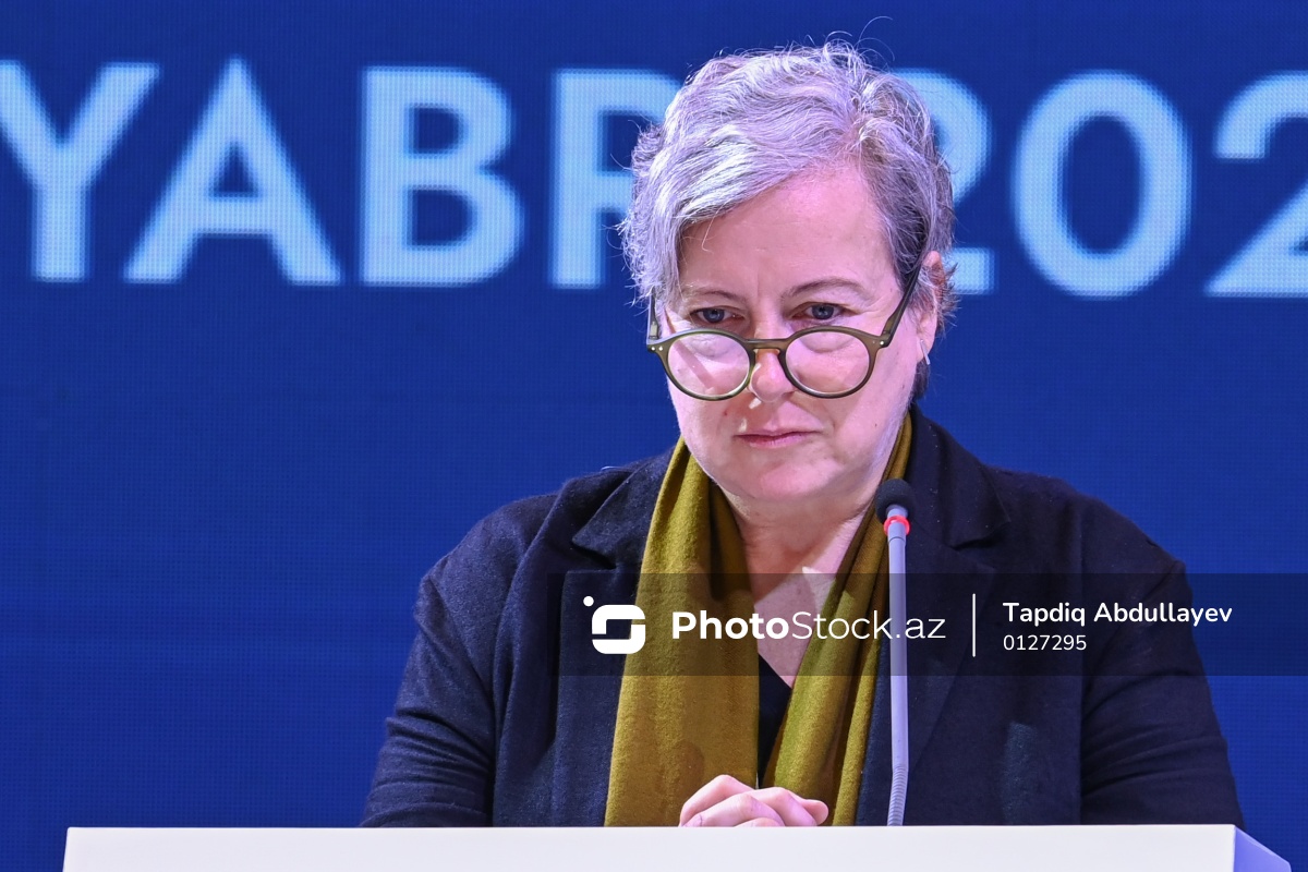 III Azərbaycan Milli Şəhərsalma Forumunda çıxış edən BMT Məskunlaşma Proqramının regionlararası məsləhətçisi Katya Şafer.