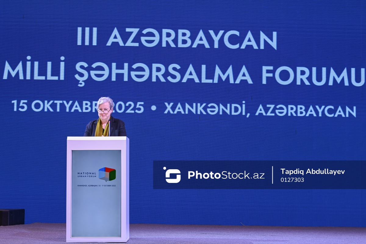 III Azərbaycan Milli Şəhərsalma Forumunda çıxış edən BMT Məskunlaşma Proqramının regionlararası məsləhətçisi Katya Şafer.