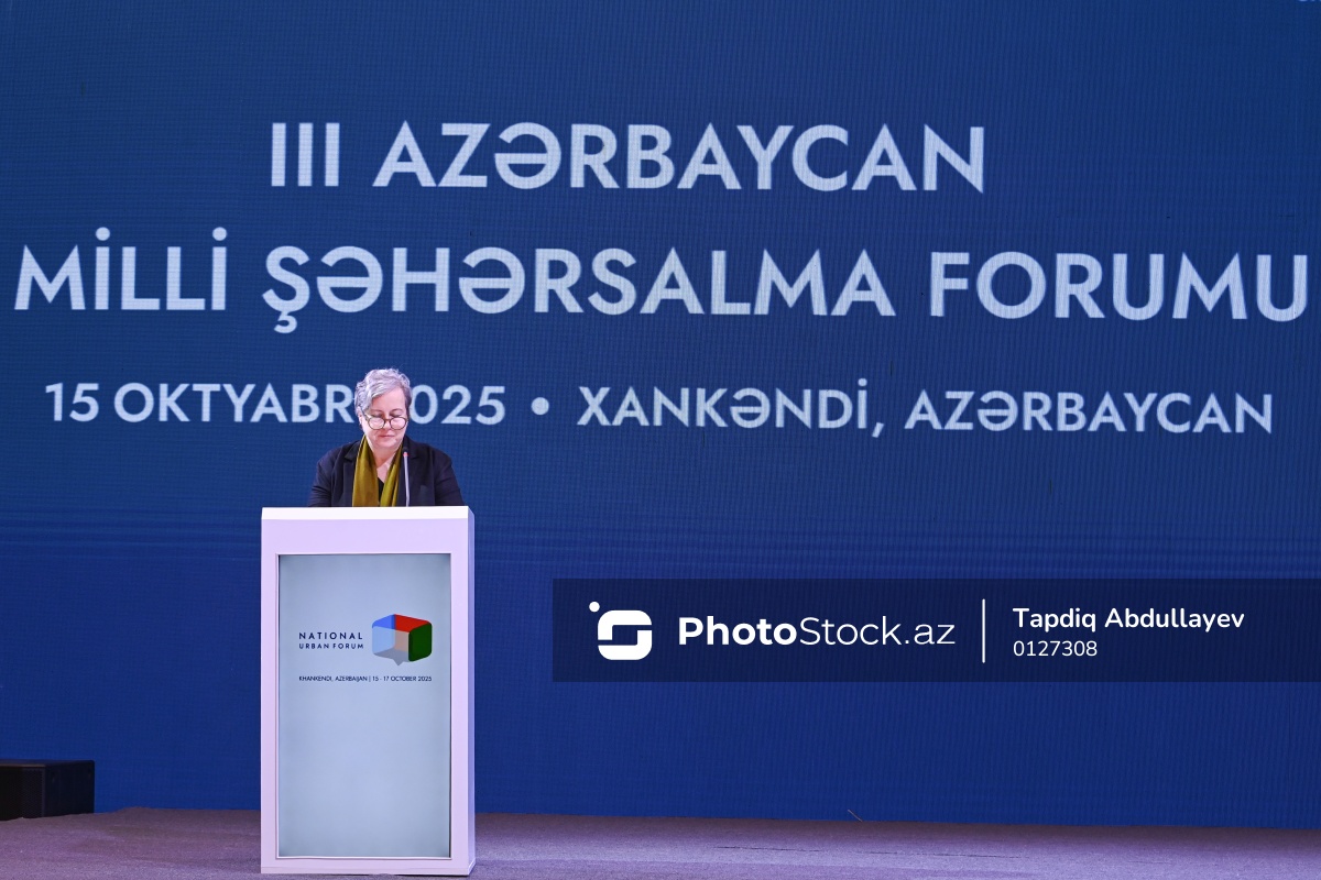 III Azərbaycan Milli Şəhərsalma Forumunda çıxış edən BMT Məskunlaşma Proqramının regionlararası məsləhətçisi Katya Şafer.