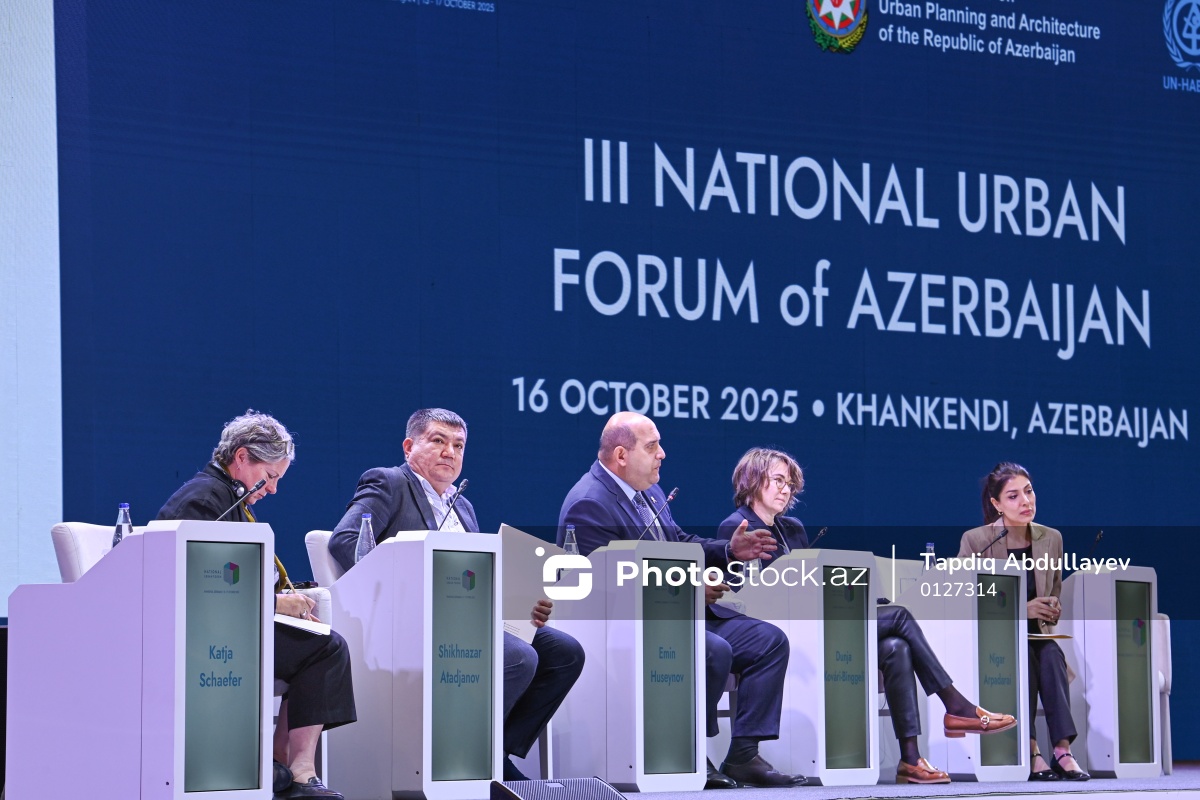 III Azərbaycan Milli Şəhərsalma Forumunda iştirak edən (soldan-sağa) BMT Məskunlaşma Proqramının regionlararası məsləhətçisi Katya Şafer, Özbəkistanın Mənzil Tikintisi və Kommunal Təsərrüfat Nazirliyinin Urbanizasiya Mərkəzinin direktoru Şihnazar Atacanov, Ağdam, Füzuli və Xocavənd rayonlarında Azərbaycan Respublikası Prezidentinin xüsusi nümayəndəsi Emin Hüseynov, “SA Partners” şirkətinin təsisçi tərəfdaşı Dunya Kovari-Binggeli, Milli Məclisin deputatı, COP29-un iqlim dəyişmələri üzrə yüksəksəviyyəli çempionu Nigar Arpadarai.