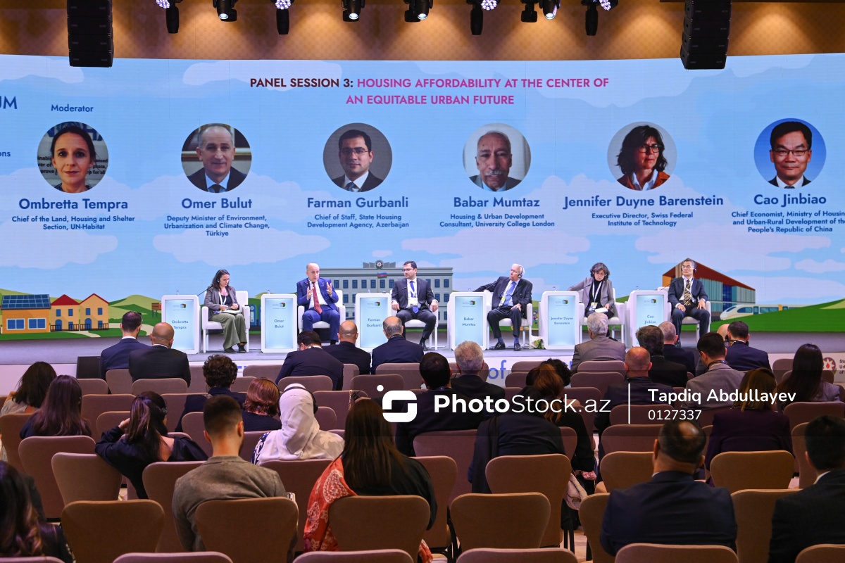 III Azərbaycan Milli Şəhərsalma Forumunda iştirak edən (soldan-sağa) BMT Məskunlaşma Proqramının Torpaq, mənzil və sığınacaq şöbəsinin rəhbəri Ombretta Tempra, Türkiyənin Ətraf Mühit, Şəhərsalma və İqlim Dəyişikliyi üzrə nazir müavini Ömər Bulut, MİDA-nın Aparat rəhbəri Fərman Qurbanlı, London Universitet Kollecinin Mənzil və şəhər inkişafı üzrə məsləhətçisi Babar Mumtaz, İsveçrə Federal Texnologiya İnstitunun icraçı direktoru Cenifer Duyn Barenşteyn, Çin Xalq Respublikasının Mənzil və Şəhər-Kənd İnkişafı Nazirliyinin baş iqtisadçısı Cao Cinpiao.