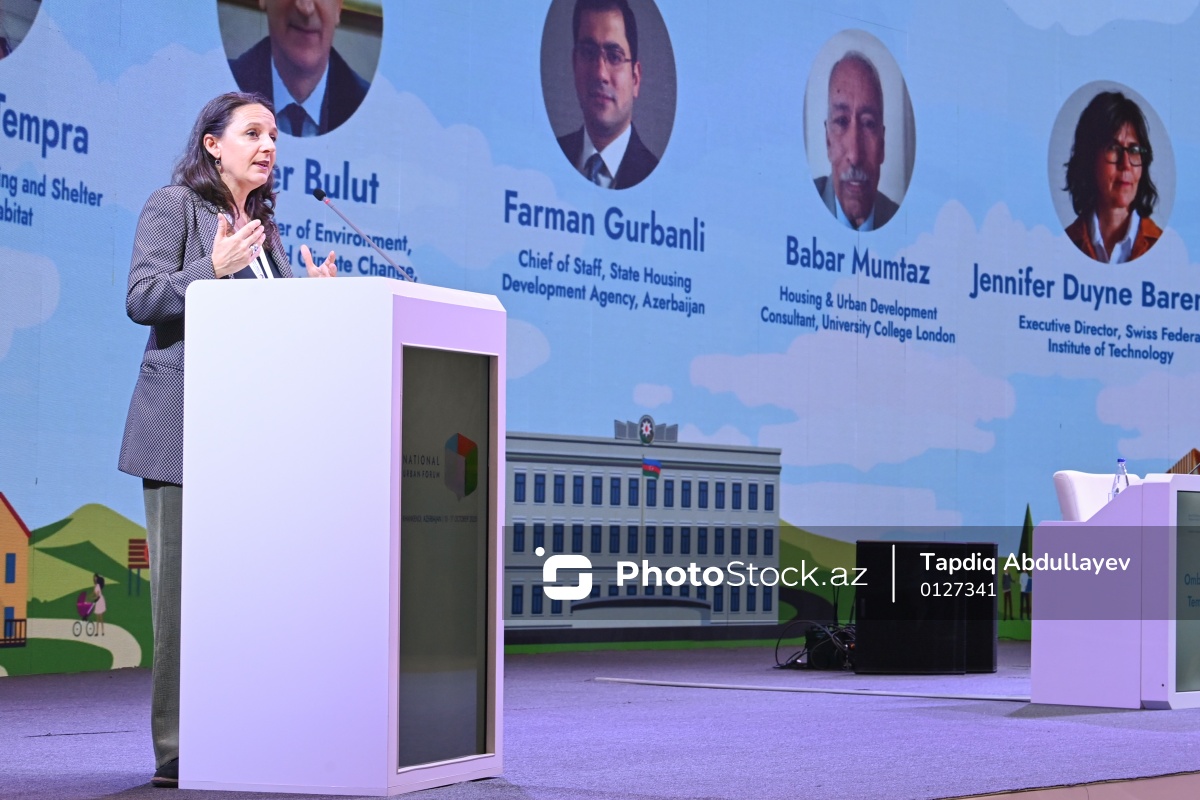 III Azərbaycan Milli Şəhərsalma Forumunda çıxış edən BMT Məskunlaşma Proqramının Torpaq, mənzil və sığınacaq şöbəsinin rəhbəri Ombretta Tempra.