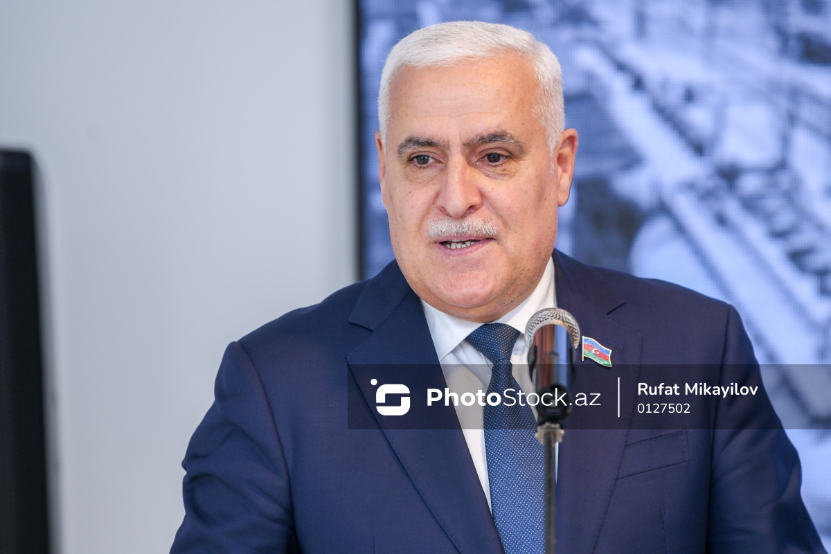 “Qara qızılın saldığı dəmir yollar” adlı fotosərginin açılışında çıxış edən Azərbaycan Respublikası Milli Məclisinin deputatı, Əməkdar jurnalist Vüqar Rəhimzadə.