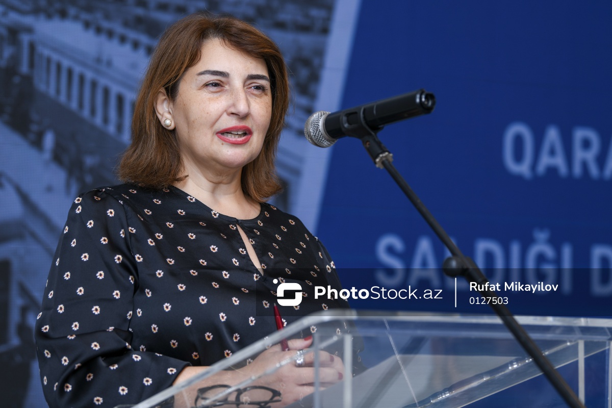 “Qara qızılın saldığı dəmir yollar” adlı fotosərginin açılışında çıxış edən "Ədibin Evi" Ədəbiyyata Dəstək Fondunun icraçı direktoru Şəfəq Mehrəliyeva.
