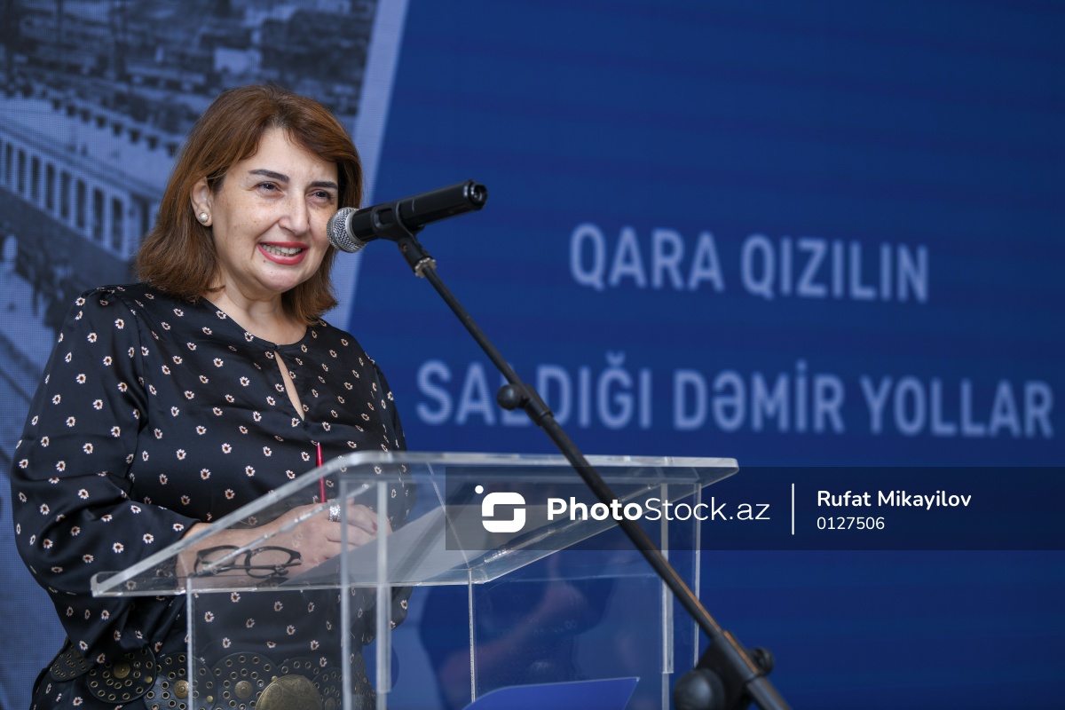“Qara qızılın saldığı dəmir yollar” adlı fotosərginin açılışında çıxış edən "Ədibin Evi" Ədəbiyyata Dəstək Fondunun icraçı direktoru Şəfəq Mehrəliyeva.