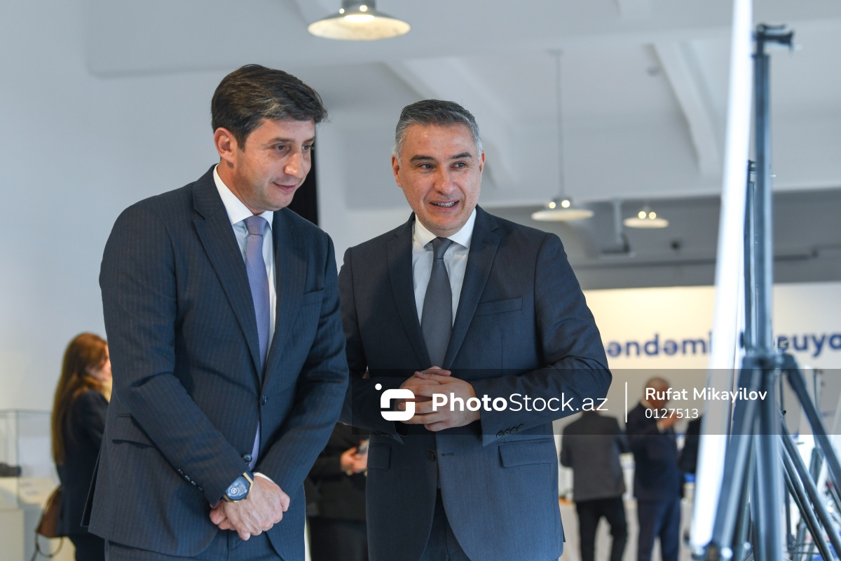 “Qara qızılın saldığı dəmir yollar” adlı fotosərginin açılışında iştirak edən "Balakhani Operating Company LTD"nin rəhbəri Rövşən Rzayev (sol) və “Azərbaycan Dəmir Yolları” QSC-nin Kommunikasiya departamentinin sədri Turxan Əhmədov (sağ).