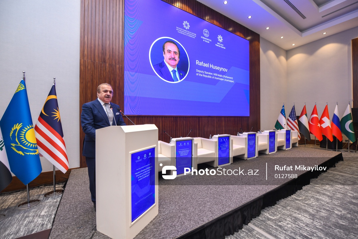 “Müasir din təhsili modelləri: mənəvi dəyərlər və qlobal çağırışlar kontekstində” beynəlxalq simpoziumda çıxış edən Azərbaycan Respublikası Milli Məclisi sədrinin müavini Rafael Hüseynov.