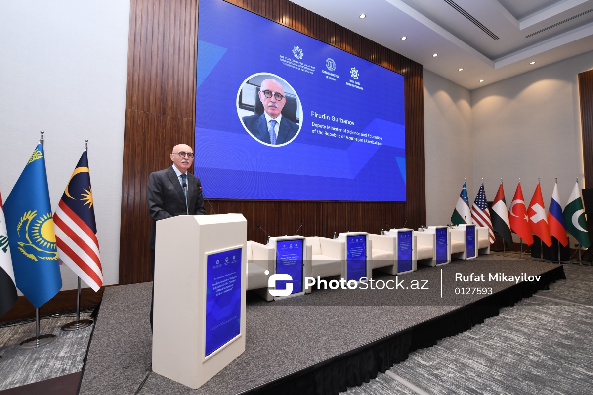 “Müasir din təhsili modelləri: mənəvi dəyərlər və qlobal çağırışlar kontekstində” beynəlxalq simpoziumda çıxış edən Azərbaycan Respublikasının elm və təhsil nazirinin müavini Firudin Qurbanov.