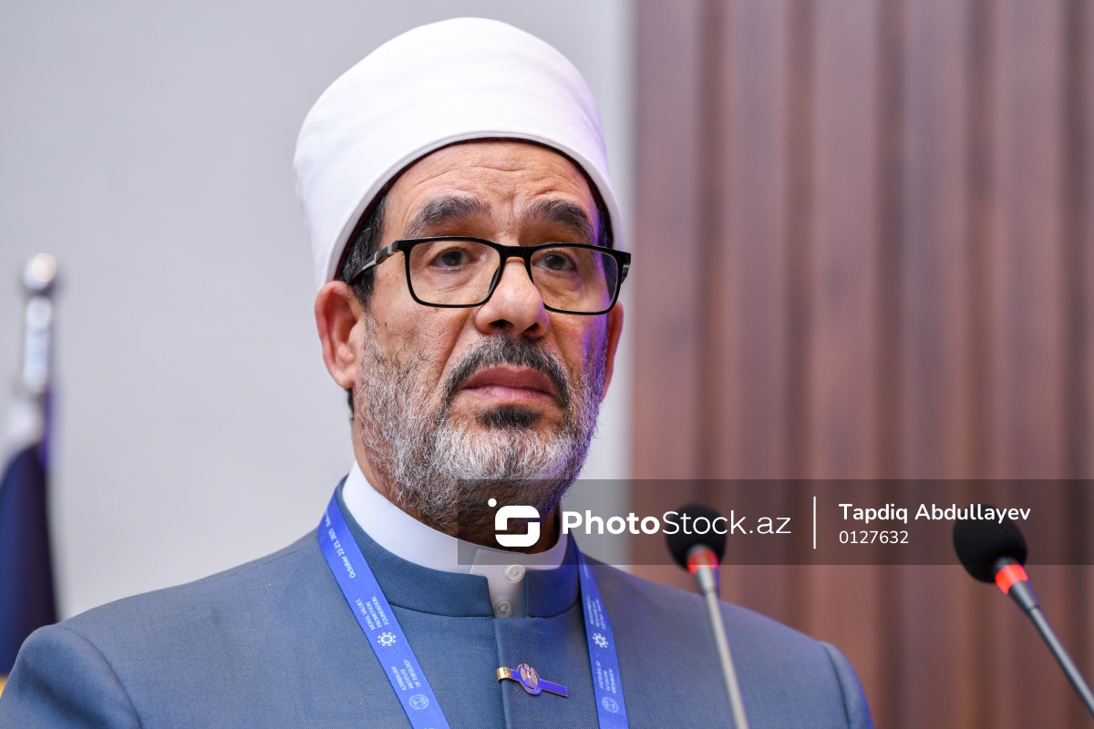 “Müasir din təhsili modelləri: mənəvi dəyərlər və qlobal çağırışlar kontekstində” beynəlxalq simpoziumda çıxış edən “Nur-Mübarək” Misir İslam Mədəniyyəti Universitetinin rektoru Əhməd Hüseyn Məhəmməd İbrahim.