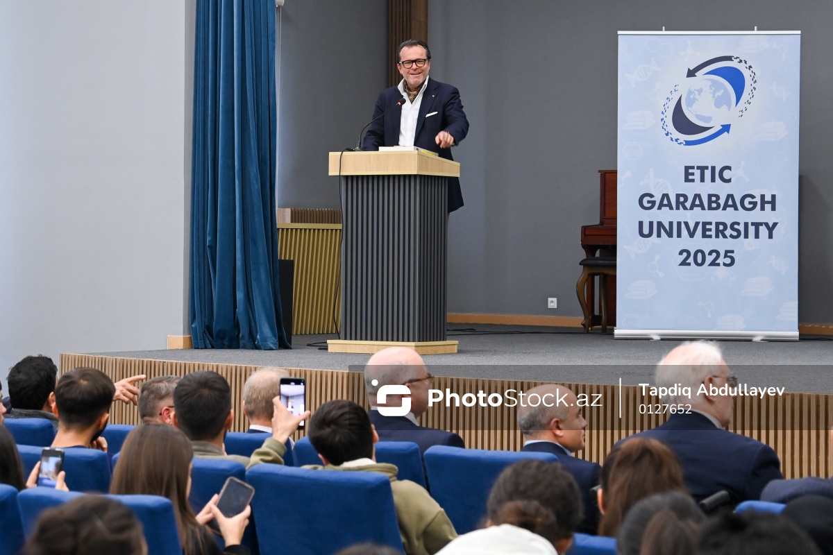 Beynəlxalq səyahətçilərin Qarabağa 15-ci səfəri çərçivəsində Qarabağ Universitetində çıxış edən Extreme Traveler International Congress (ETIC) klubunun rəhbəri Kolja Spori.