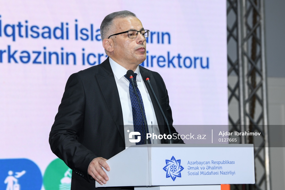 "PeşəFest-2025"in yekun tədbirində çıxış edən İqtisadi İslahatların Təhlili və Kommunikasiya Mərkəzinin icraçı direktoru Vüsal Qasımlı.