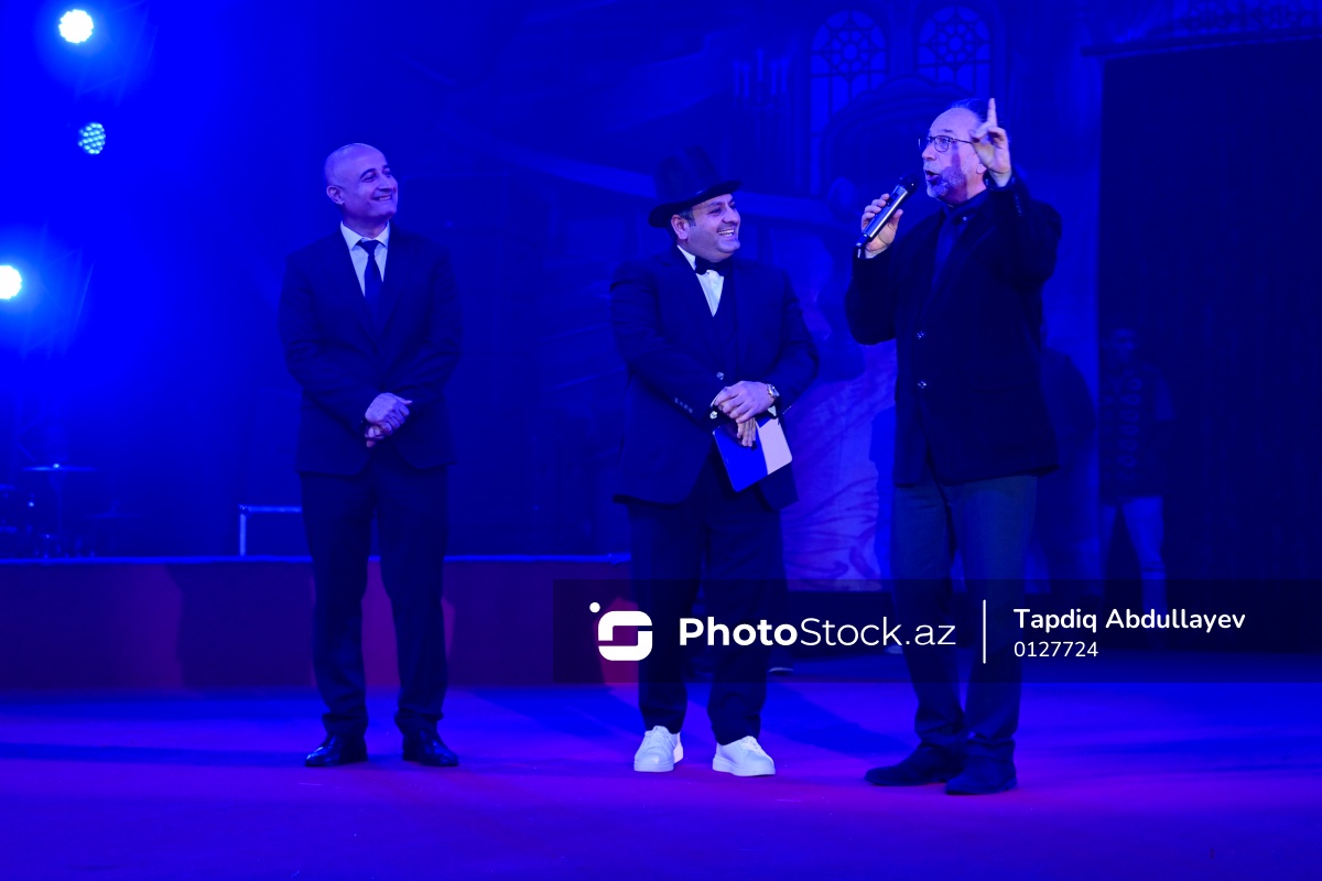 Bakıda təşkil olunan Avropanın ən böyük şapito sirkinin açılışında iştirak edən (soldan-sağa) Bakı Dövlət Sirkinin direktoru Nahid Ağayev, aparıcı, aktyor Elcan Rəsulov və Budapeşt Dövlət Sirkinin direktoru Peter Fekete.