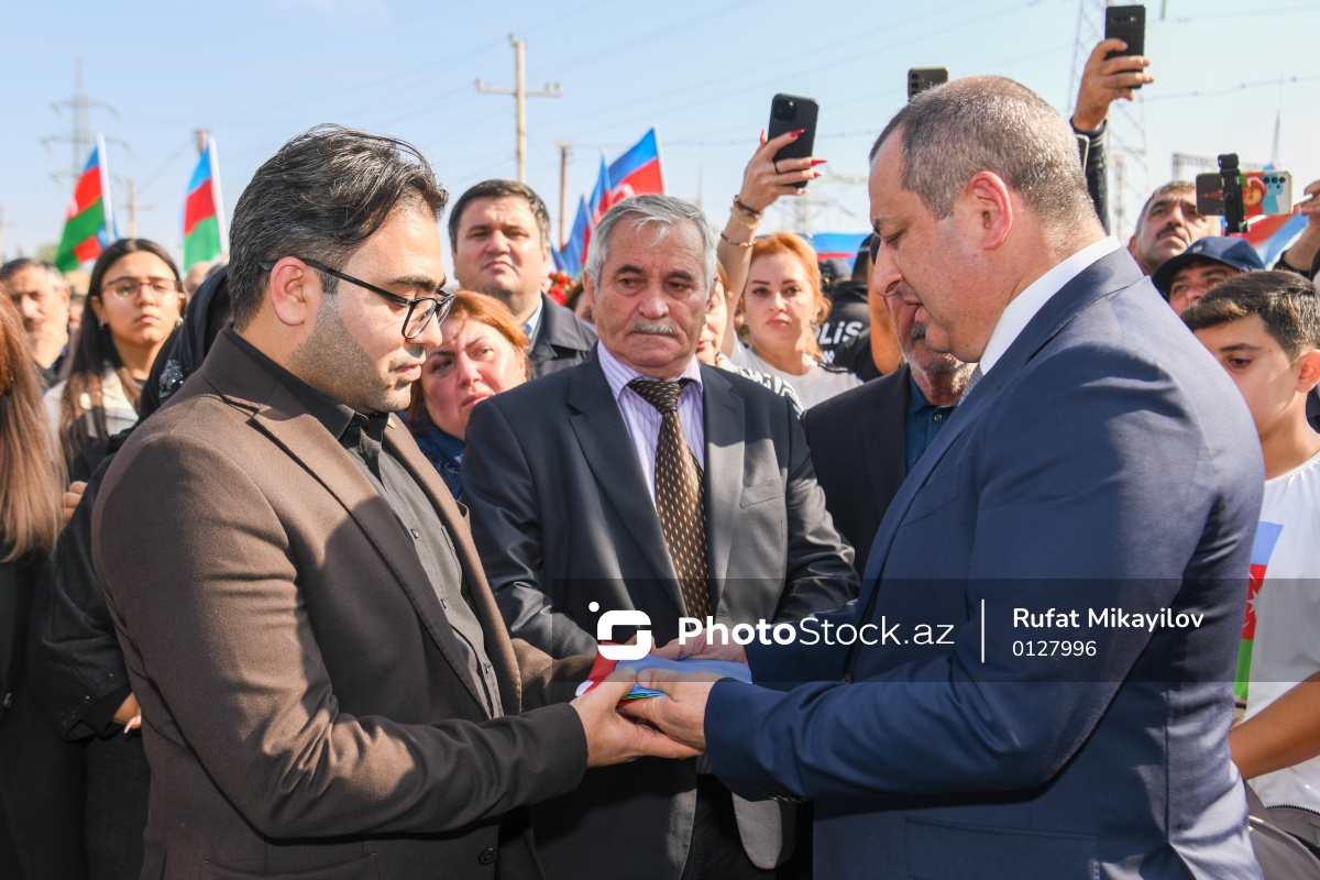 Birinci Qarabağ Müharibəsində itkin düşmüş hesab edilən və nəşlərinin qalıqları 33 il sonra tapılan itkin şəhid Əliyar Əliyevin nəşinin qalıqları Suraxanı rayonu "Dədə Qorqud" qəbiristanlığındakı Şəhidlər Xiyabanında torpağa tapşırılıb. Dəfn mərasimində şəhidin oğlu Əliəsgər Əliyevə (sol) Suraxanı Rayon İcra Hakimiyyətinin başçısı Adil Əliyev (sağ) tərəfindən dövlət bayrağı təqdim olunub.
