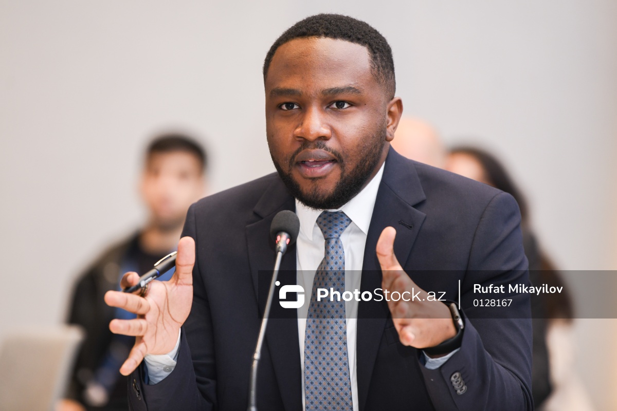 Bakıda keçirilən "Belçika müstəmləkəçiliyi: Tanınma və Məsuliyyət" adlı beynəlxalq konfransda iştirak edən BMT-nin Narkotiklər və Cinayətkarlıqla Mübarizə İdarəsində layihə üzrə mütəxəssis Cessi Mudiay.
