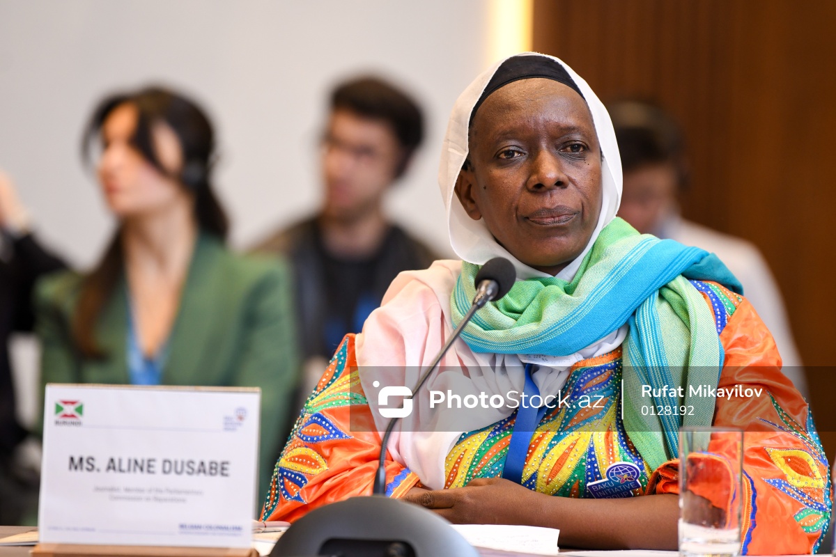 Bakıda keçirilən "Belçika müstəmləkəçiliyi: Tanınma və Məsuliyyət" adlı beynəlxalq konfransda iştirak edən Reparasiyalar üzrə Parlament Komissiyasının üzvü, burundili jurnalist Aline Dusabe.