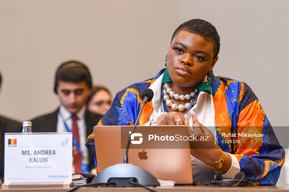 Bakıda keçirilən "Belçika müstəmləkəçiliyi: Tanınma və Məsuliyyət" adlı beynəlxalq konfransda iştirak edən Konqo Demokratik Respublikasından olan fəal, siyasi xadim və insan haqları müdafiəçisi Andrea Kalubi.