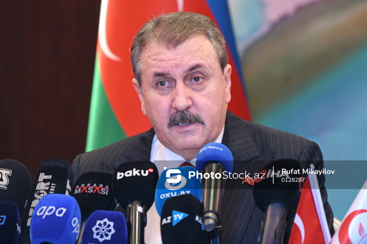 Azərbaycana səfəri çərçivəsində keçirdiyi mətbuat konfransında çıxış edən Türkiyənin Böyük Birlik Partiyasının (BBP) sədri Mustafa Destici.