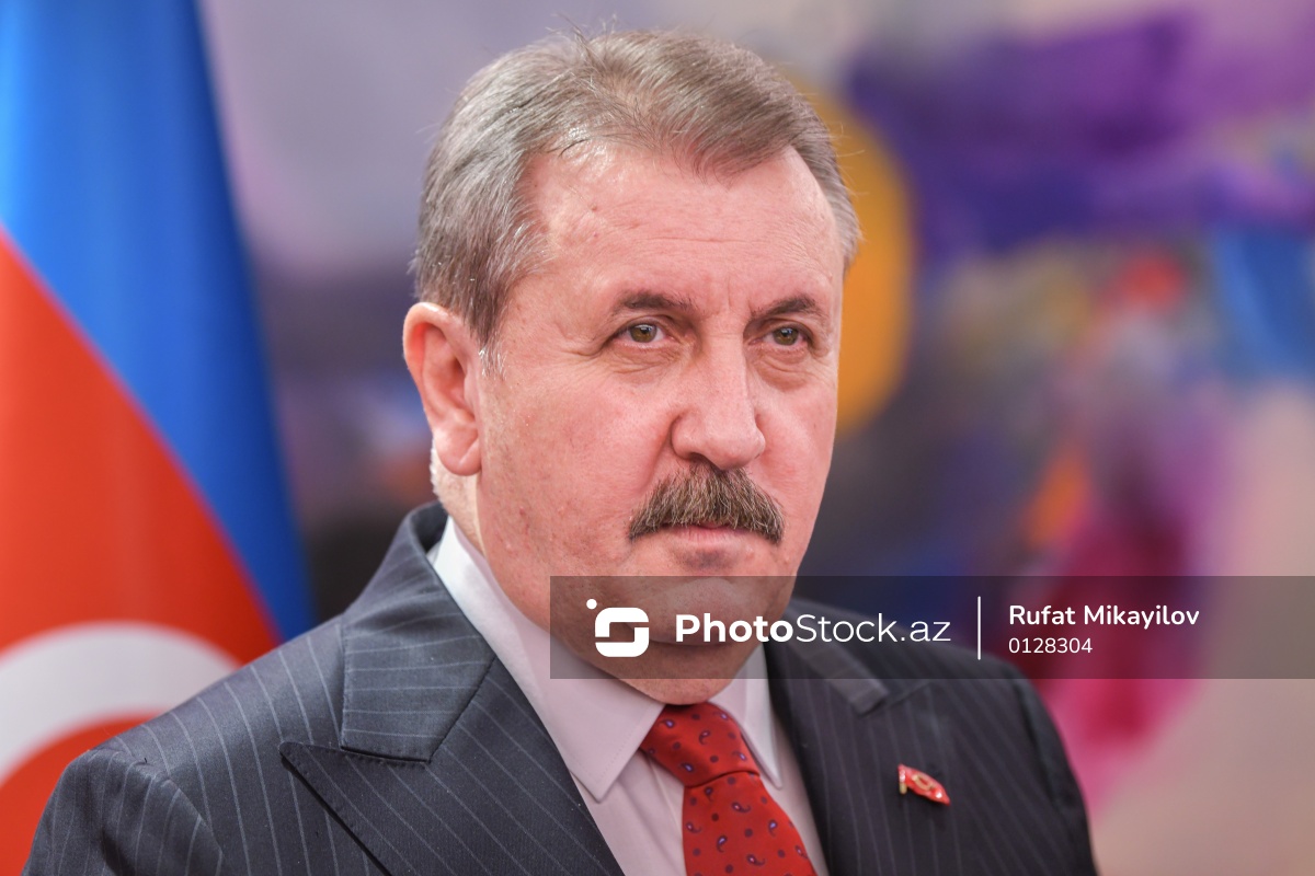 Azərbaycana səfəri çərçivəsində keçirdiyi mətbuat konfransında çıxış edən Türkiyənin Böyük Birlik Partiyasının (BBP) sədri Mustafa Destici.