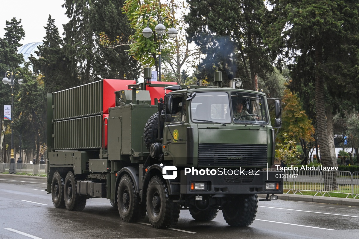 Bakıda Zəfər Gününün beşinci ildönümü münasibətilə təşkil olunan hərbi paradın məşq prosesində nümayiş olunan "Lora" raket kompleksi.