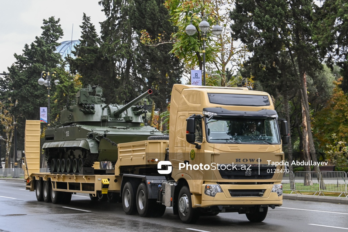Bakıda Zəfər Gününün beşinci ildönümü münasibətilə təşkil olunan hərbi paradın məşq prosesində nümayiş olunan 2S31 "Vena" özüyeriyən artilleriya qurğusu.