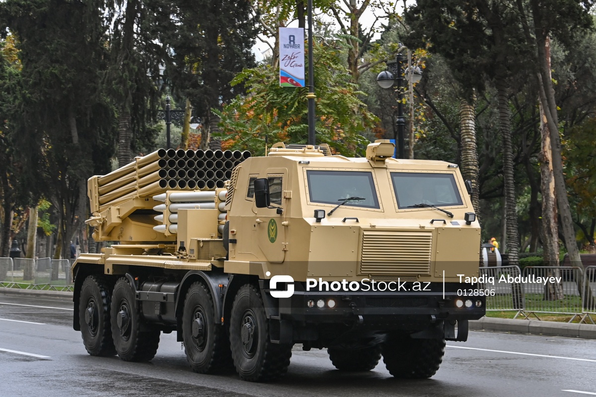 Bakıda Zəfər Gününün beşinci ildönümü münasibətilə təşkil olunan hərbi paradın məşq prosesində nümayiş olunan "RM-70 Vampire" reaktiv yaylım atəş sistemi.