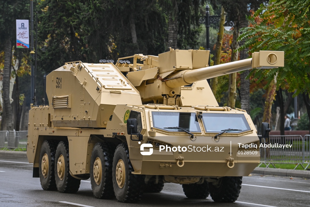 Bakıda Zəfər Gününün beşinci ildönümü münasibətilə təşkil olunan hərbi paradın məşq prosesində nümayiş olunan “DANA” özüyeriyən artilleriya qurğusu.