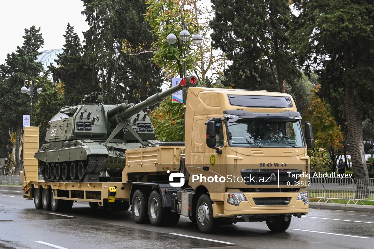 Bakıda Zəfər Gününün beşinci ildönümü münasibətilə təşkil olunan hərbi paradın məşq prosesində nümayiş olunan 2S19 “MSTA-S” özüyeriyən artileriya qurğusu.