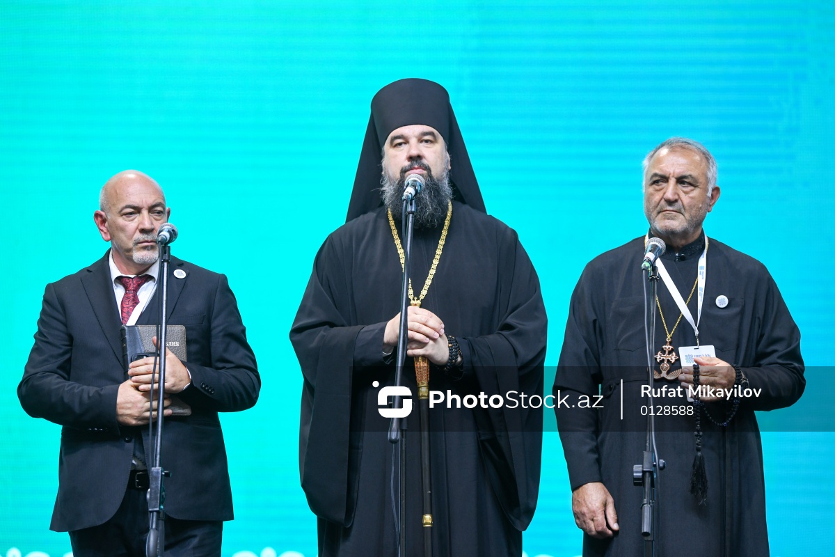 “Fərqliliyin rəngi” festivalında iştirak edən (soldan-sağa) Bakı şəhəri “Azərbaycan Bibliya Cəmiyyəti” xristian dini icmasının sədri Rasim Xəlilov, Rus Pravoslav Kilsəsinin Bakı və Azərbaycan Yeparxiyasının rəhbəri Aleksiy Smirnov və Alban-Udi xristian dini icmasının sədr müavini Rafik Danakari.