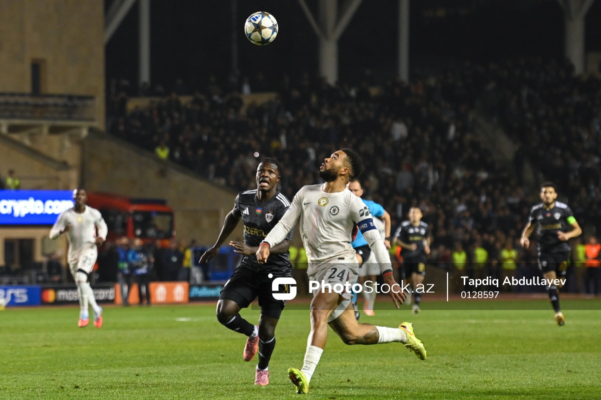 05.11.2025 Tofiq Bəhramov adına Respublika stadionu, UEFA Çempionlar Liqasının “Qarabağ” - "Çelsi" oyununda "Qarabağ” komandasının oyunçusu Emmanuel Addai (solda) və "Çelsi” komandasının oyunçusu Ris Ceyms (sağda) mübarizəsi.