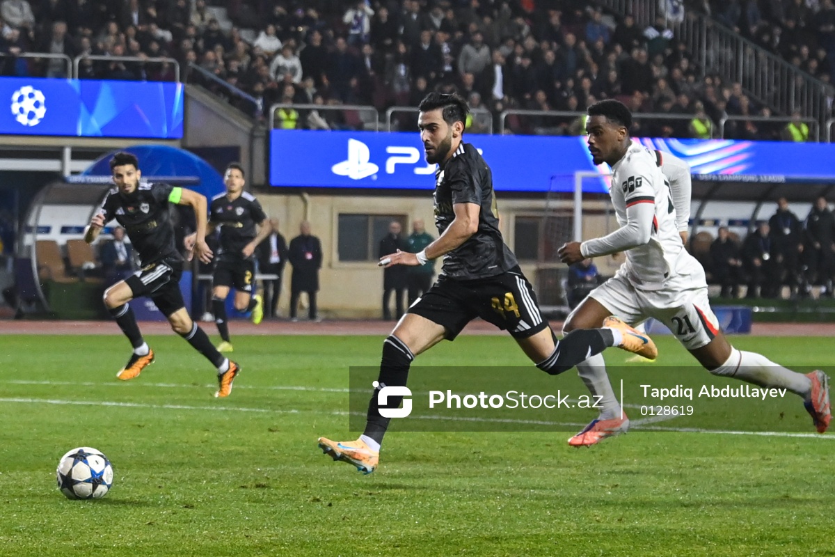 05.11.2025 Tofiq Bəhramov adına Respublika stadionu, UEFA Çempionlar Liqasının “Qarabağ” - "Çelsi" oyununda "Qarabağ” komandasının oyunçusu Elvin Cəfərquliyev (solda) və "Çelsi” komandasının oyunçusu Yorrel Hato (sağda) mübarizəsi.