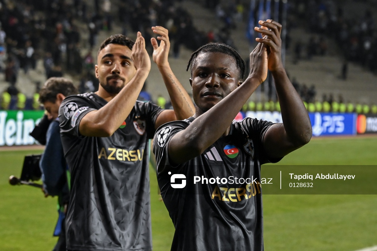 05.11.2025 Tofiq Bəhramov adına Respublika stadionu, UEFA Çempionlar Liqasının “Qarabağ” - "Çelsi" oyununda "Qarabağ” komandasının oyunçuları Leandro Andrade (solda) və Emmanuel Addai (sağda).