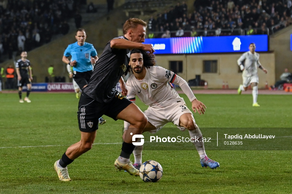 05.11.2025 Tofiq Bəhramov adına Respublika stadionu, UEFA Çempionlar Liqasının “Qarabağ” - "Çelsi" oyununda "Qarabağ” komandasının oyunçusu Aleksey Kaşuk (solda) və "Çelsi” komandasının oyunçusu Mark Kukurelya (sağda) mübarizəsi.