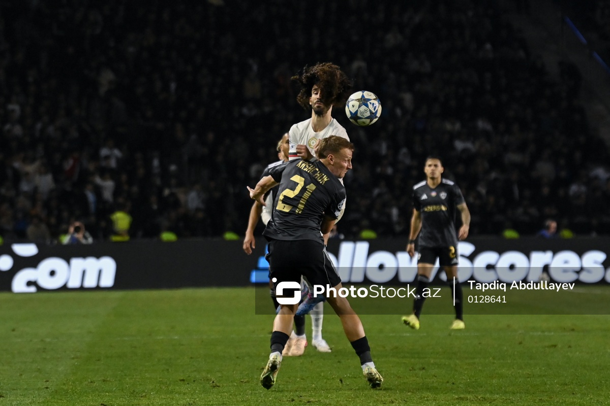 05.11.2025 Tofiq Bəhramov adına Respublika stadionu, UEFA Çempionlar Liqasının “Qarabağ” - "Çelsi" oyununda "Qarabağ” komandasının oyunçusu Aleksey Kaşuk (öndə) və "Çelsi” komandasının oyunçusu Mark Kukurelya (arxada) mübarizəsi.